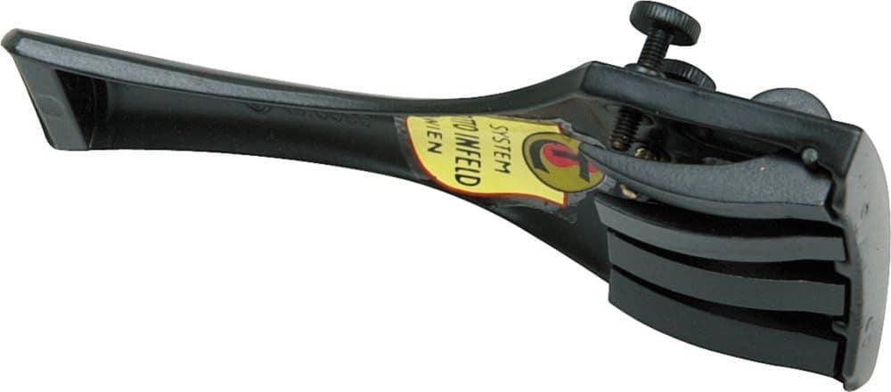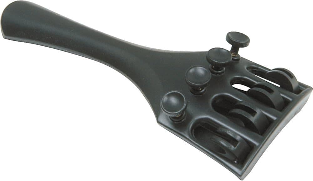 Thomastik 4/4 violin tailpiece made from a light metal alloy with four built-in fine tuning string adjusters. Complete with nylon adjustable tailpiece wire. The unique pattern of the Thomastik tailpiece gives a better clearance over the top of the violin due to the arching design and also allows the strings to be carried to the bridge without any deflection.